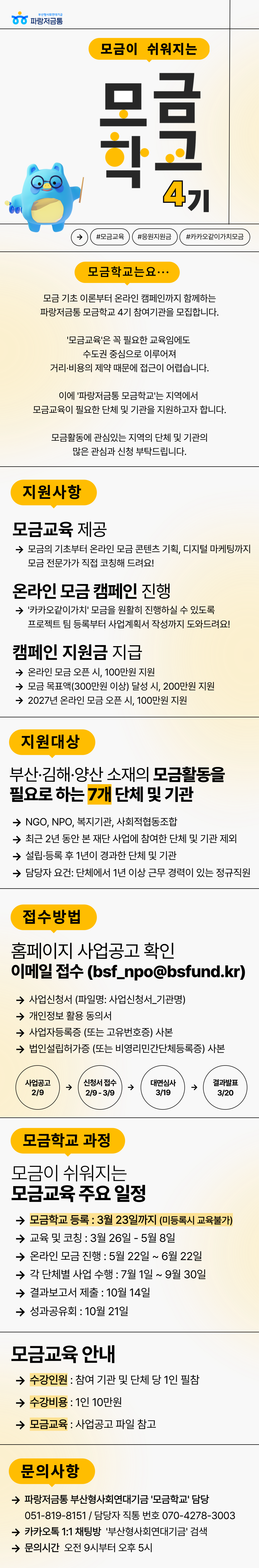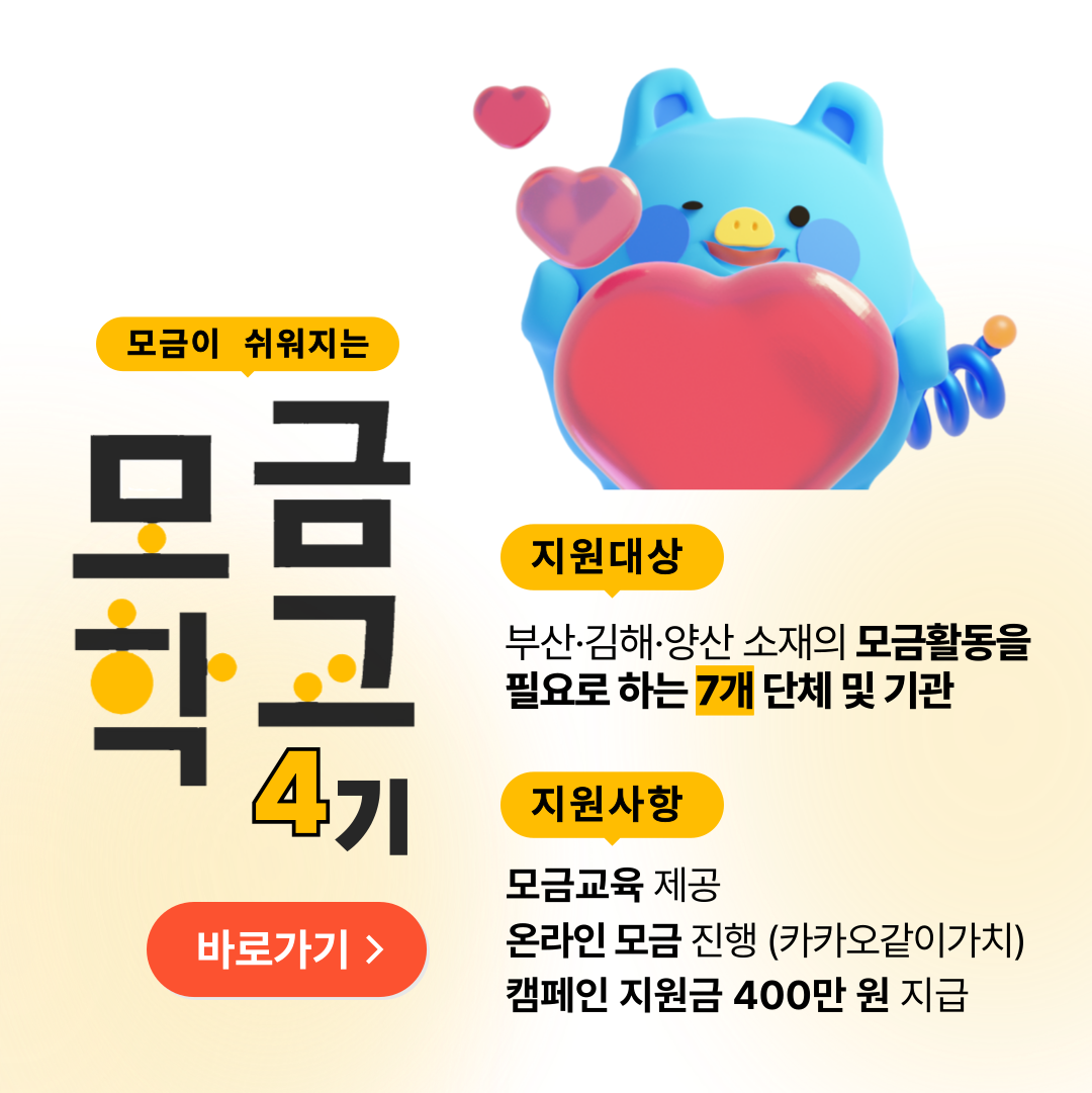 ๋ชจ๊ธ ๊ธฐ์ด ์ด๋ก ๋ถํฐ ์จ๋ผ์ธ ์บ ํ์ธ๊น์ง ํจ๊ปํ๋ ํ๋์ ๊ธํต ๋ชจ๊ธํ๊ต 4๊ธฐ ์ฐธ์ฌ๊ธฐ๊ด์ ๋ชจ์งํฉ๋๋ค. '๋ชจ๊ธ๊ต์ก'์ ์๋๊ถ ์ค์ฌ์ผ๋ก ์งํ๋์ด ๊ฑฐ๋ฆฌยท๋น์ฉ์ ์ ์ฝ๋๋ฌธ์ ๋ถ์ฐ์ง์ญ์ ๋จ์ฒด์ ๊ธฐ๊ด์ ์ ๊ทผ์ด ์ด๋ ต์ต๋๋ค. ์ด์ ์ง์ญ์์ ๊ณต์ตํ๋์ ์ํ ๋ชจ๊ธ ํ๋ก์ ํธ๋ฅผ ์ง์ํ๊ณ ์ ํฉ๋๋ค.